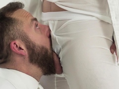 Thoughtful priest massages stressed twink and fucks him